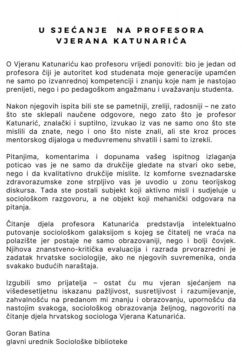 S velikom tugom vas obavještavamo da nas je u Zadru napustio naš kolega i prijatelj Vjeran Katunarić. Ostali smo bez dragog kolege i iznimne intelektualne pojave. Vjeran je ostavio neizbrisiv trag u sociologiji, primarno kroz brojne znanstvene radove u području sociološke teorije, etničkih odnosa, interkulturalizma, roda i kulture.